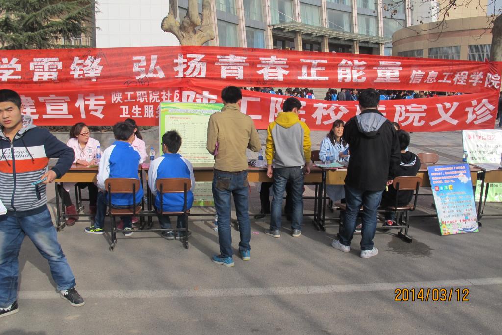 春风送暖,爱心送情。为弘扬志愿服务精神,践行党的群众路线, 2014年3月12日下午,信息工程学院组织团总支学生会联合校医院共同在我院成才大道开展学雷锋、树新风的“义诊”和签字活动。