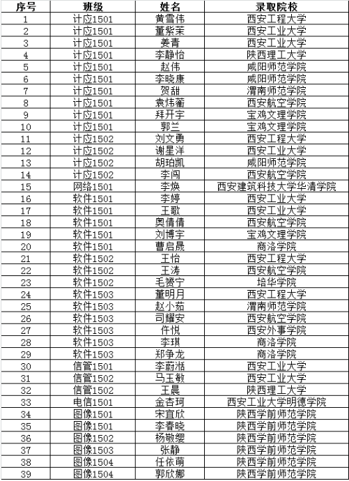 2018年专升本录取工作基本结束,我院共有62名学生参加,其中39名学生达到专升本最低控制线并全部被本科院校录取,占全院专升本上线人数的63%,创信息工程学院专升本历史最好成绩。以下39名同学最终被西安工业大学、西安工程大学、陕西理工大学、咸阳师范学院、渭南师范学院、西安航空学院、宝鸡文理学院、西安外事学院、陕西学前师范学院、西安工业大学明德学院、西安建筑科技大学华清学院、培华学院、商洛学院等13所本科院校录取。