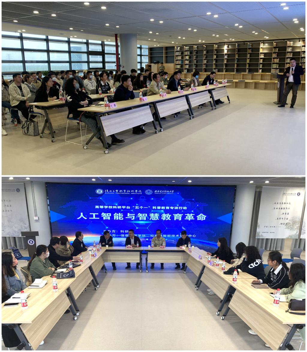 4月13日下午,“人工智能与智慧教育革命”学术沙龙在经开校区图文信息中心工院记忆研习空间成功举办。本次学术沙龙由科研处主办,信息工程学院、校视觉智能研究中心承办,特邀西安电子科技大学曹志诚博士主讲,西安电子科技大学生命科学院庞辽军教授、赵恒副教授和西安交通大学出版社曹昳副编审作沙龙与谈人,信息工程学院副院长白国政主持,视觉智能研究中心科研团队成员、22级本科班全体学生共同参与。